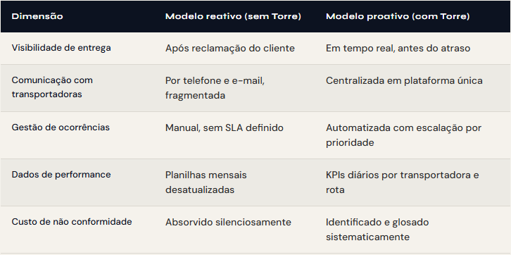 O termo vem da aviação — e faz todo o sentido. Uma torre de controle aeroportuária enxerga todos os voos, sabe a posição de cada aeronave, antecipa conflitos de rota e gerencia desvios antes que eles se tornem acidentes. A Torre de Controle Logística opera exatamente com essa lógica, mas sobre a sua malha de transporte e distribuição.